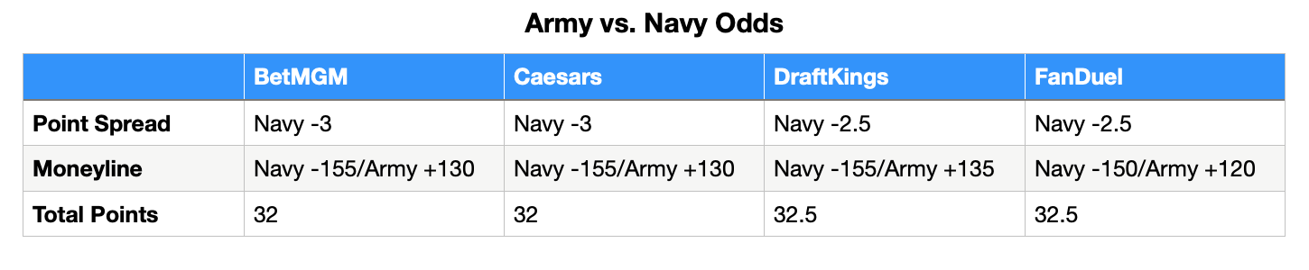 Oddsmakers don’t believe Army and Navy will be a high-scoring affair, setting the total at a nearly historic low. According to ESPN Stats & Info, only the Iowa-Minnesota game from this season featured a lower over/under – 31.5 points – of any game offered in the last 20 years.