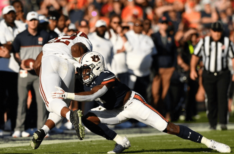 For the first time since the 2013 season, Alabama was eliminated from the college football championship chase in the regular season. Auburn’s Noah Igbinoghene lays a hit on Alabama running…