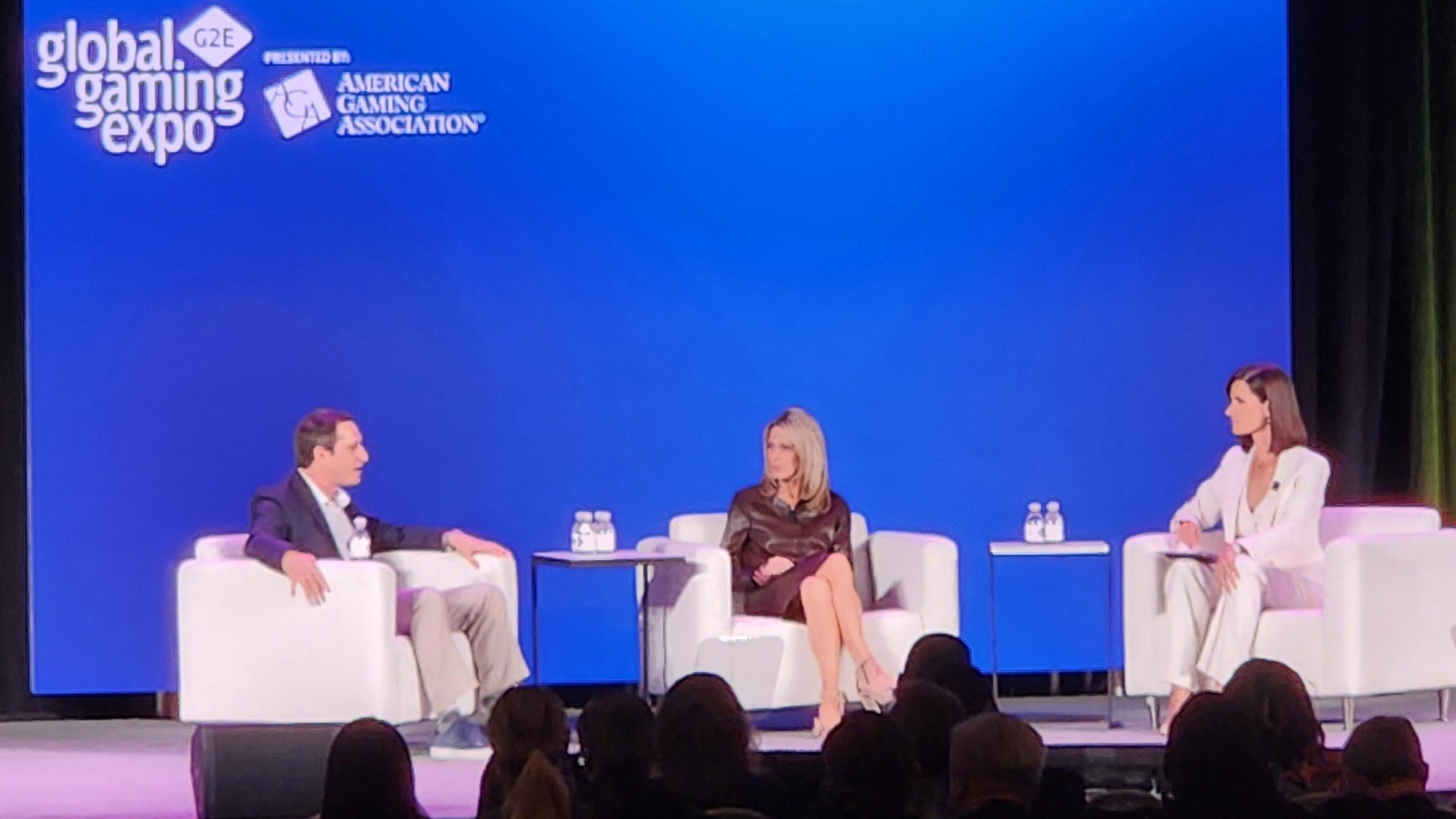 Jason Robins of DraftKings speaks during a keynote session at the 2022 Global Gaming Expo in Las Vegas, with FanDuel’s Amy Howe (center) and CNBC’s Contessa Brewer listening. On Friday, the Ohio Casino Control Commission said it intends to fine DraftKings $350,000 after it sent sports betting promotional mailers to roughly 2,500 people under the age of 21. (Image: Casino.org)