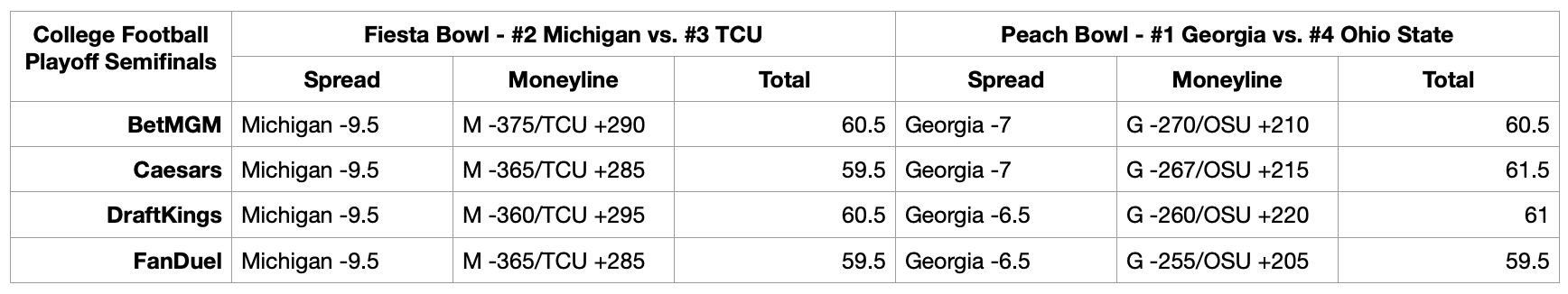 While the official pairings weren’t announced until shortly after noon ET Sunday, FanDuel had spreads posted hours before the reveal. They listed Michigan as a 9.5-point favorite over TCU and Georgia as a 6.5-point favorite over Ohio State.