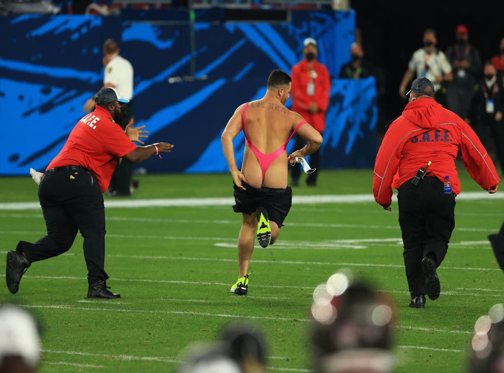 Yuri Andrade, 31, of Florida, briefly caused a stir by taking to the field with 5:03 left in the fourth quarter, with the Buccaneers leading the Chiefs 31-9. The professional extrovert dodged a couple of tackles from security before sliding at the three-yard line as guards piled on top of him.